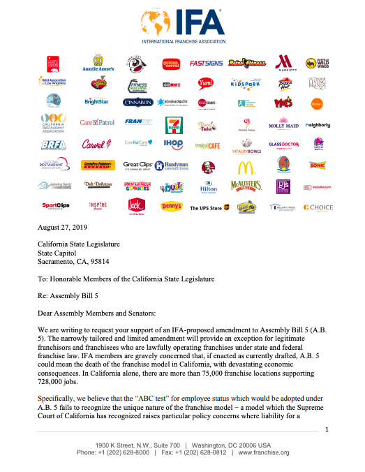 Over 160 American franchise companies - from household names to emerging businesses - as well as the California Hotel & Lodging Association, the California Restaurant Association, the Hotel Association of Los Angeles, the Long Beach Hospitality Alliance, the National Restaurant Association, and the International Franchise Association sent a coalition letter to the California Legislature, urging an amendment to AB 5 which would protect franchise businesses in the Golden State.